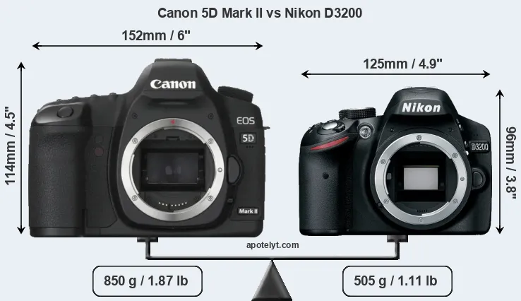 La dimensione fisica e il peso della Canon 5D Mark II e Nikon D3200 sono illustrate nel grafico sottostante. Le due fotocamere vengono visualizzate in base alle loro dimensioni relative. Tutte le dimensioni sono arrotondate al millimetro più vicino.