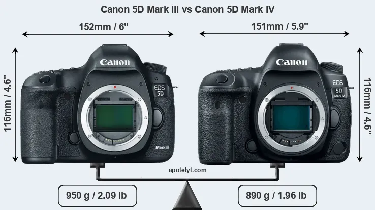 La dimensione fisica e il peso della Canon 5D Mark III e Canon 5D Mark IV sono illustrate nel grafico sottostante. Le due fotocamere vengono visualizzate in base alle loro dimensioni relative. Tutte le dimensioni sono arrotondate al millimetro più vicino.