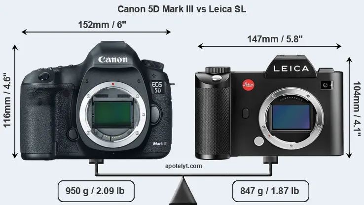 La Canon EOS 5D Mark III e la Leica SL (Typ 601) sono due fotocamere digitali rivelate al pubblico rispettivamente a marzo 2012 e ottobre 2015. Il 5D Mark III è una fotocamera DSLR, mentre Leica SL è una fotocamera mirrorless con obiettivo intercambiabile.Entrambe le fotocamere sono dotati di un sensore full frame. La Canon ha una risoluzione di 22,1 megapixel, mentre la Leica fornisce 24,0 MP.