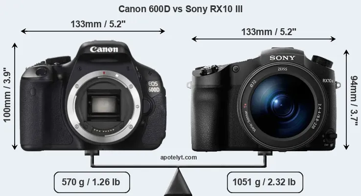 La Canon EOS 600D e la Sony Cyber-shot DSC-RX10 III sono due fotocamere digitali rivelate al pubblico rispettivamente a febbraio 2011 e marzo 2016. Il 600D è una fotocamera DSLR, mentre RX10 III è una fotocamera compatta con obiettivo integrato. Le fotocamere sono dotati di un sensore APS-C (600D) e un sensore da 1 pollice (RX10 III). La Canon ha una risoluzione di 17,9 megapixel, mentre la Sony fornisce 20,0 MP.