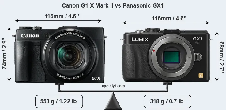 La Canon PowerShot G1 X Mark II e la Panasonic Lumix DMC-GX1 sono due fotocamere digitali rivelate al pubblico rispettivamente a febbraio 2014 e novembre 2011. Il G1X Mark II è una fotocamera compatta con obiettivo integrato, mentre GX1 è una fotocamera mirrorless con obiettivo intercambiabile. Le fotocamere sono dotati di un sensore da 1,5 pollici (G1X Mark II) e un sensore Quattro Terzi (GX1). La Canon ha una risoluzione di 13,0 megapixel, mentre la Panasonic fornisce 15,8 MP.