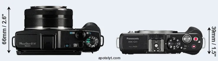 La dimensione fisica e il peso della Canon G1 X Mark II e Panasonic GX1 sono illustrate nel grafico sottostante. Le due fotocamere vengono visualizzate in base alle loro dimensioni relative. Tutte le dimensioni sono arrotondate al millimetro più vicino.