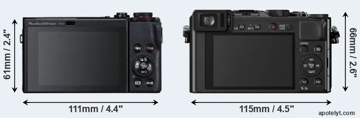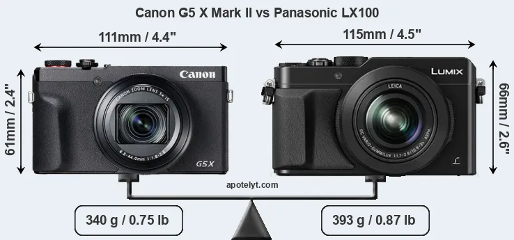 La dimensione fisica e il peso della Canon G5 X Mark II e Panasonic LX100 sono illustrate nel grafico sottostante. Le due fotocamere vengono visualizzate in base alle loro dimensioni relative. Tutte le dimensioni sono arrotondate al millimetro più vicino.