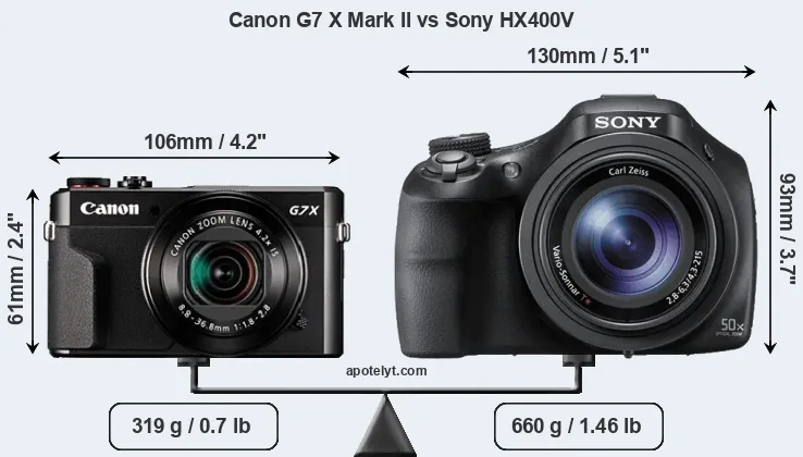 La Canon PowerShot G7 X Mark II e la Sony Cyber-shot DSC-HX400V sono due fotocamere digitali rivelate al pubblico rispettivamente a febbraio 2016 e febbraio 2014. Sia il G7X Mark II e il HX400V sono fotocamere compatte con obiettivo integrato, che sono dotati di un sensore da 1 pollice (G7X Mark II) e un sensore da 1/2,3 pollice (HX400V). La Canon ha una risoluzione di 20,0 megapixel, mentre la Sony fornisce 20,2 MP.
