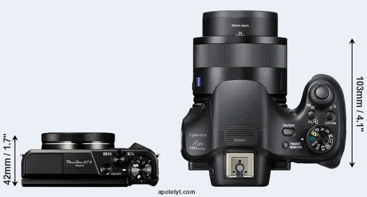 La dimensione fisica e il peso della Canon G7 X Mark II e Sony HX400V sono illustrate nel grafico sottostante. Le due fotocamere vengono visualizzate in base alle loro dimensioni relative. Tutte le dimensioni sono arrotondate al millimetro più vicino.