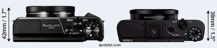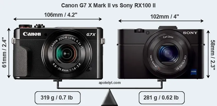 La Canon PowerShot G7 X Mark II e la Sony Cyber-shot DSC-RX100 II sono due fotocamere digitali rivelate al pubblico rispettivamente a febbraio 2016 e giugno 2013. Sia il G7X Mark II e il RX100 II sono fotocamere compatte con obiettivo integrato, che sono dotati di un sensore da 1 pollice. Entrambe le fotocamere offrono una risoluzione di 20,0 megapixel.