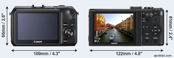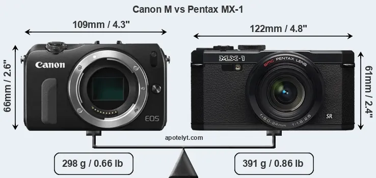 La Canon EOS M e la Pentax MX-1 sono due fotocamere digitali rivelate al pubblico rispettivamente a luglio 2012 e gennaio 2013. Il Canon M è una fotocamera mirrorless con obiettivo intercambiabile, mentre MX-1 è una fotocamera compatta con obiettivo integrato. Le fotocamere sono dotati di un sensore APS-C (Canon M) e un sensore da 1/1,7 pollice (MX-1). La Canon ha una risoluzione di 17,9 megapixel, mentre la Pentax fornisce 12,0 MP.