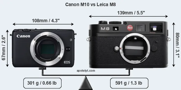 La dimensione fisica e il peso della Canon M10 e Leica M8 sono illustrate nel grafico sottostante. Le due fotocamere vengono visualizzate in base alle loro dimensioni relative. Tutte le dimensioni sono arrotondate al millimetro più vicino.