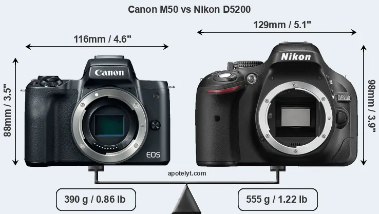 La dimensione fisica e il peso della Canon M50 e Nikon D5200 sono illustrate nel grafico sottostante. Le due fotocamere vengono visualizzate in base alle loro dimensioni relative. Tutte le dimensioni sono arrotondate al millimetro più vicino.
