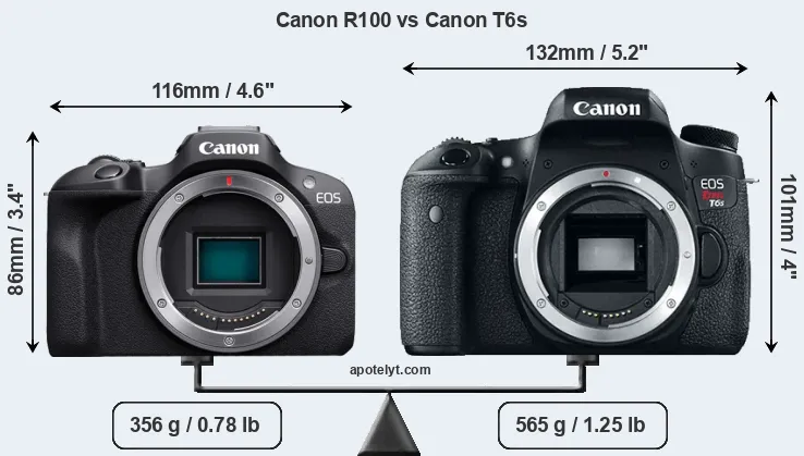 La dimensione fisica e il peso della Canon R100 e Canon T6s sono illustrate nel grafico sottostante. Le due fotocamere vengono visualizzate in base alle loro dimensioni relative. Tutte le dimensioni sono arrotondate al millimetro più vicino.