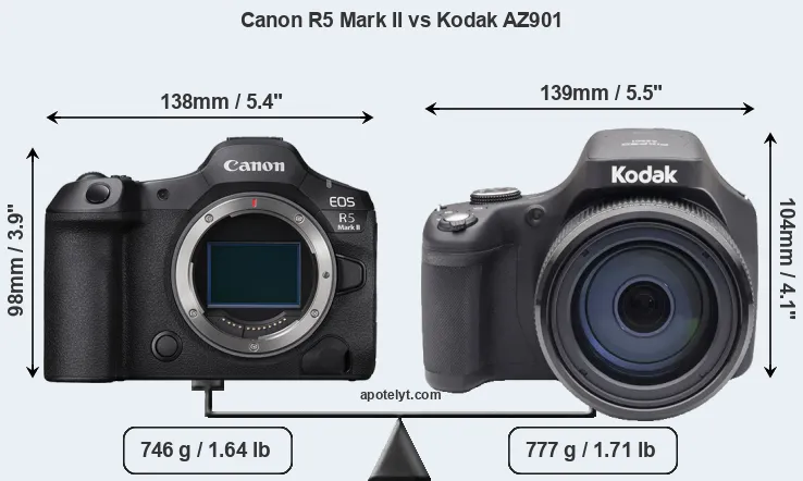 La dimensione fisica e il peso della Canon R5 Mark II e Kodak AZ901 sono illustrate nel grafico sottostante. Le due fotocamere vengono visualizzate in base alle loro dimensioni relative. Tutte le dimensioni sono arrotondate al millimetro più vicino.