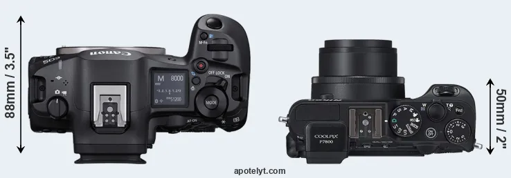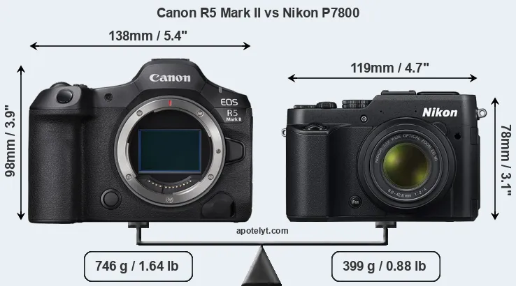 La dimensione fisica e il peso della Canon R5 Mark II e Nikon P7800 sono illustrate nel grafico sottostante. Le due fotocamere vengono visualizzate in base alle loro dimensioni relative. Tutte le dimensioni sono arrotondate al millimetro più vicino.