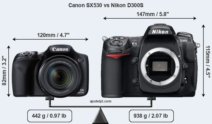 La dimensione fisica e il peso della Canon SX530 e Nikon D300S sono illustrate nel grafico sottostante. Le due fotocamere vengono visualizzate in base alle loro dimensioni relative. Tutte le dimensioni sono arrotondate al millimetro più vicino.