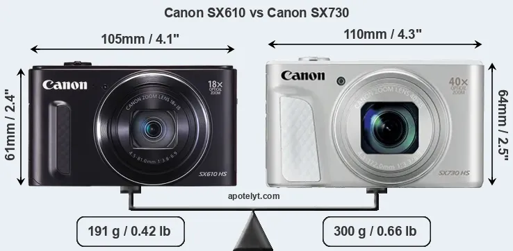 La dimensione fisica e il peso della Canon SX610 e Canon SX730 sono illustrate nel grafico sottostante. Le due fotocamere vengono visualizzate in base alle loro dimensioni relative. Tutte le dimensioni sono arrotondate al millimetro più vicino.