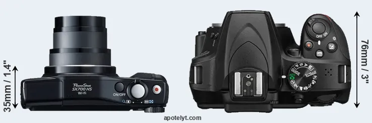 La dimensione fisica e il peso della Canon SX700 e Nikon D3400 sono illustrate nel grafico sottostante. Le due fotocamere vengono visualizzate in base alle loro dimensioni relative. Tutte le dimensioni sono arrotondate al millimetro più vicino.