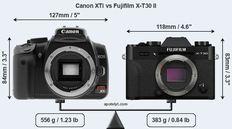 La dimensione fisica e il peso della Canon XTi e Fujifilm X-T30 II sono illustrate nel grafico sottostante. Le due fotocamere vengono visualizzate in base alle loro dimensioni relative. Tutte le dimensioni sono arrotondate al millimetro più vicino.