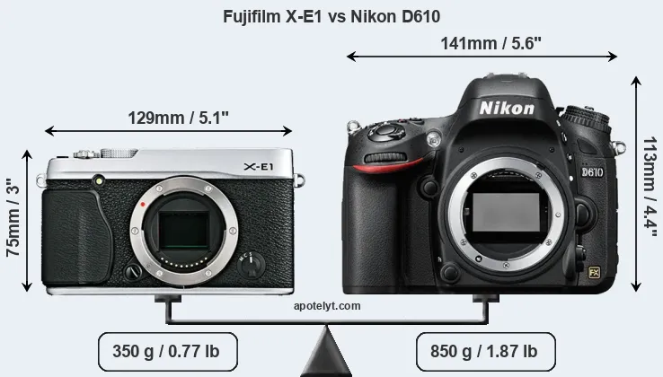 La dimensione fisica e il peso della Fujifilm X-E1 e Nikon D610 sono illustrate nel grafico sottostante. Le due fotocamere vengono visualizzate in base alle loro dimensioni relative. Tutte le dimensioni sono arrotondate al millimetro più vicino.