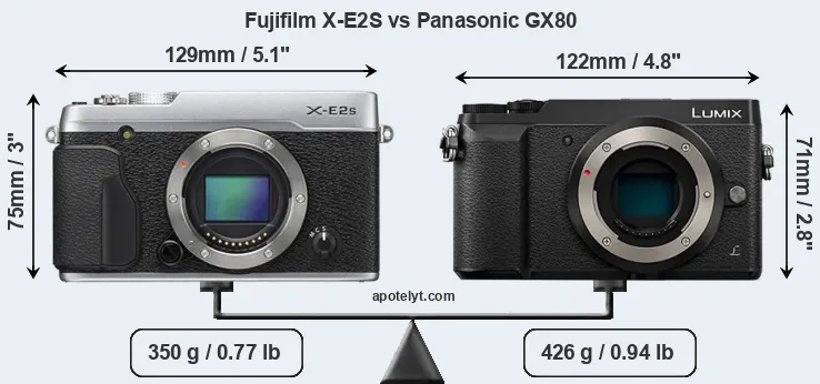 La Fujifilm X-E2S e la Panasonic Lumix DMC-GX80 sono due fotocamere digitali rivelate al pubblico rispettivamente a gennaio 2016 e aprile 2016. Entrambe sono fotocamera mirrorless con obiettivo intercambiabile, che sono dotati di un sensore APS-C (X-E2S) e un sensore Quattro Terzi (GX80). La Fujifilm ha una risoluzione di 16,0 megapixel, mentre la Panasonic fornisce 15,8 MP.