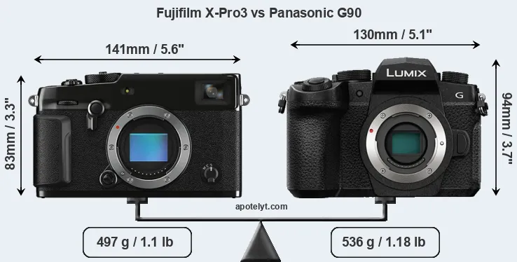 La dimensione fisica e il peso della Fujifilm X-Pro3 e Panasonic G90 sono illustrate nel grafico sottostante. Le due fotocamere vengono visualizzate in base alle loro dimensioni relative. Tutte le dimensioni sono arrotondate al millimetro più vicino.