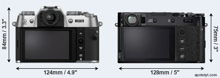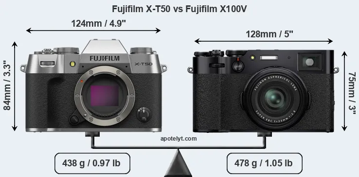 La Fujifilm X-T50 e la Fujifilm X100V sono due fotocamere digitali rivelate al pubblico rispettivamente a maggio 2024 e febbraio 2020. Il X-T50 è una fotocamera mirrorless con obiettivo intercambiabile, mentre X100V è una fotocamera compatta con obiettivo integrato. Entrambe le fotocamere sono dotati di un sensore APS-C. La X-T50 ha una risoluzione di 39,8 megapixel, mentre la X100V fornisce 26,0 MP.