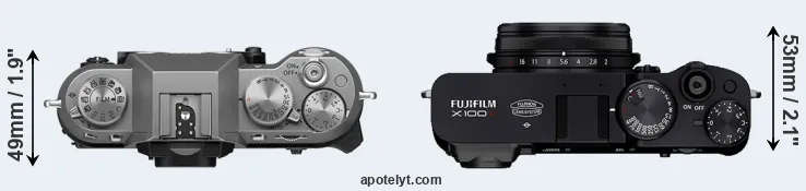 La dimensione fisica e il peso della Fujifilm X-T50 e Fujifilm X100V sono illustrate nel grafico sottostante. Le due fotocamere vengono visualizzate in base alle loro dimensioni relative. Tutte le dimensioni sono arrotondate al millimetro più vicino.