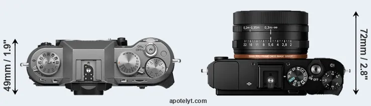 La dimensione fisica e il peso della Fujifilm X-T50 e Sony RX1R II sono illustrate nel grafico sottostante. Le due fotocamere vengono visualizzate in base alle loro dimensioni relative. Tutte le dimensioni sono arrotondate al millimetro più vicino.
