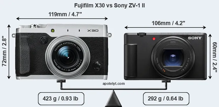 La Fujifilm X30 e la Sony Cyber-shot ZV-1 II sono due fotocamere digitali rivelate al pubblico rispettivamente a agosto 2014 e maggio 2023. Sia il X30 e il ZV-1 II sono fotocamere compatte con obiettivo integrato, che sono dotati di un sensore da 2/3 pollice (X30) e un sensore da 1 pollice (ZV-1 II). La Fujifilm ha una risoluzione di 12,0 megapixel, mentre la Sony fornisce 20,0 MP.
