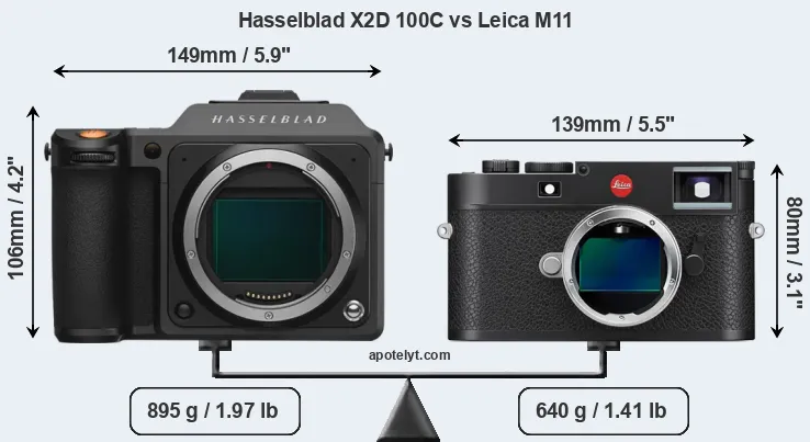 La Hasselblad X2D 100C e la Leica M11 (Typ 2416) sono due fotocamere digitali rivelate al pubblico rispettivamente a settembre 2022 e gennaio 2022. Il X2D 100C è una fotocamera mirrorless con obiettivo intercambiabile, mentre M11 è una fotocamera mirrorless con messa a fuoco a telemetro. Le fotocamere sono dotati di un sensore di medio formato (X2D 100C) e un sensore full frame (M11). La Hasselblad ha una risoluzione di 102,1 megapixel, mentre la Leica fornisce 60,3 MP.