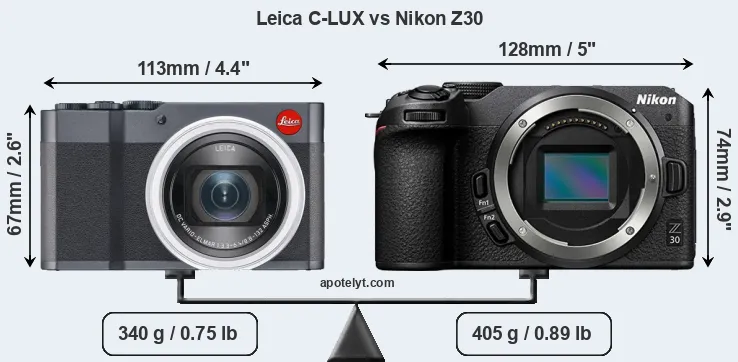 La dimensione fisica e il peso della Leica C-LUX e Nikon Z30 sono illustrate nel grafico sottostante. Le due fotocamere vengono visualizzate in base alle loro dimensioni relative. Tutte le dimensioni sono arrotondate al millimetro più vicino.