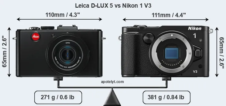 La Leica D-LUX 5 e la Nikon 1 V3 sono due fotocamere digitali rivelate al pubblico rispettivamente a settembre 2010 e marzo 2014. Il D-LUX 5 è una fotocamera compatta con obiettivo integrato, mentre V3 è una fotocamera mirrorless con obiettivo intercambiabile. Le fotocamere sono dotati di un sensore da 1/1.7 pollice (D-LUX 5) e un sensore da 1 pollice (V3). La Leica ha una risoluzione di 10,0 megapixel, mentre la Nikon fornisce 18,2 MP.