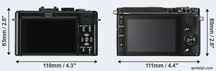 La dimensione fisica e il peso della Leica D-LUX 5 e Nikon 1 V3 sono illustrate nel grafico sottostante. Le due fotocamere vengono visualizzate in base alle loro dimensioni relative. Tutte le dimensioni sono arrotondate al millimetro più vicino.