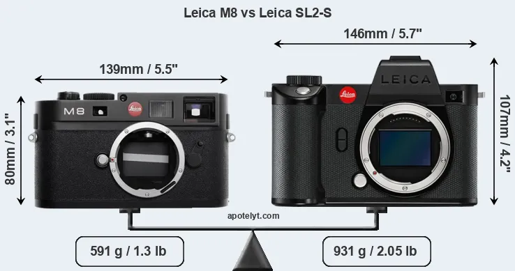 La Leica M8 e la Leica SL2-S sono due fotocamere digitali rivelate al pubblico rispettivamente a settembre 2006 e dicembre 2020. Il M8 è una fotocamera mirrorless con messa a fuoco a telemetro, mentre Leica SL2-S è una fotocamera mirrorless con obiettivo intercambiabile. Le fotocamere sono dotati di un sensore APS-H (M8) e un sensore full frame (Leica SL2-S). La M8 ha una risoluzione di 10,4 megapixel, mentre la Leica SL2-S fornisce 24,0 MP.