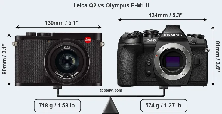 La Leica Q2 e la Olympus OM-D E-M1 Mark II sono due fotocamere digitali rivelate al pubblico rispettivamente a marzo 2019 e settembre 2016. Il Q2 è una fotocamera compatta con obiettivo integrato, mentre E-M1 II è una fotocamera mirrorless con obiettivo intercambiabile. Le fotocamere sono dotati di un sensore full frame (Q2) e un sensore Quattro Terzi (E-M1 II). La Leica ha una risoluzione di 46,7 megapixel, mentre la Olympus fornisce 20,2 MP.