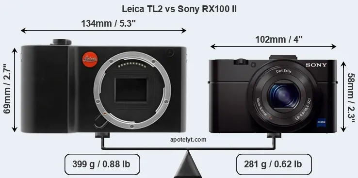 La Leica TL2 e la Sony Cyber-shot DSC-RX100 II sono due fotocamere digitali rivelate al pubblico rispettivamente a luglio 2017 e giugno 2013. Il TL2 è una fotocamera mirrorless con obiettivo intercambiabile, mentre RX100 II è una fotocamera compatta con obiettivo integrato. Le fotocamere sono dotati di un sensore APS-C (TL2) e un sensore da 1 pollice (RX100 II). La Leica ha una risoluzione di 24,1 megapixel, mentre la Sony fornisce 20,0 MP.