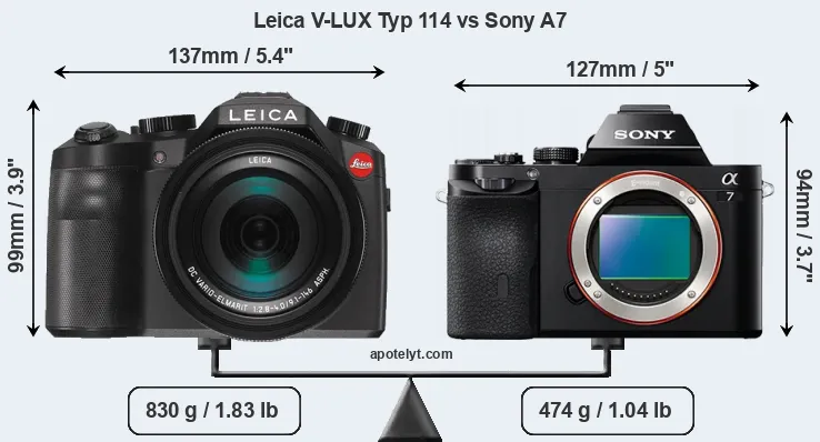 La Leica V-LUX (Typ 114) e la Sony Alpha A7 sono due fotocamere digitali rivelate al pubblico rispettivamente a settembre 2014 e ottobre 2013. Il V-LUX Typ 114 è una fotocamera compatta con obiettivo integrato, mentre A7 è una fotocamera mirrorless con obiettivo intercambiabile. Le fotocamere sono dotati di un sensore da 1 pollice (V-LUX Typ 114) e un sensore full frame (A7). La Leica ha una risoluzione di 20,0 megapixel, mentre la Sony fornisce 24,0 MP.