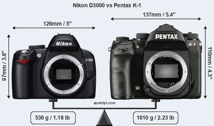 La Nikon D3000 e la Pentax K-1 sono due fotocamere digitali rivelate al pubblico rispettivamente a luglio 2009 e febbraio 2016. Entrambe sono fotocamere DSLR (Digital Single Lens Reflex) che sono dotati di un sensore APS-C (D3000) e un sensore full frame (K-1). La Nikon ha una risoluzione di 10,0 megapixel, mentre la Pentax fornisce 36,2 MP.