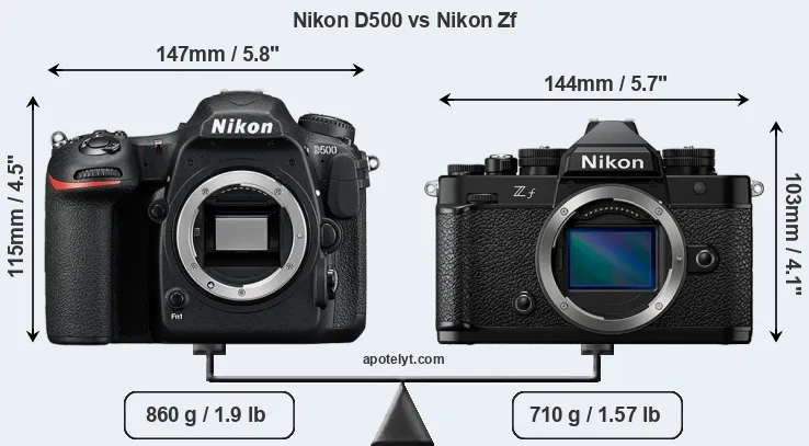 La dimensione fisica e il peso della Nikon D500 e Nikon Zf sono illustrate nel grafico sottostante. Le due fotocamere vengono visualizzate in base alle loro dimensioni relative. Tutte le dimensioni sono arrotondate al millimetro più vicino.