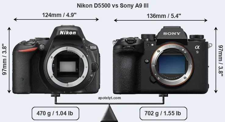 La dimensione fisica e il peso della Nikon D5500 e Sony A9 III sono illustrate nel grafico sottostante. Le due fotocamere vengono visualizzate in base alle loro dimensioni relative. Tutte le dimensioni sono arrotondate al millimetro più vicino.