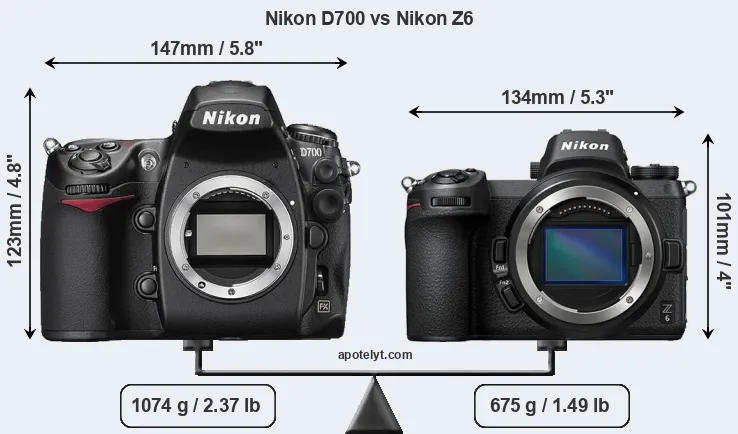 La dimensione fisica e il peso della Nikon D700 e Nikon Z6 sono illustrate nel grafico sottostante. Le due fotocamere vengono visualizzate in base alle loro dimensioni relative. Tutte le dimensioni sono arrotondate al millimetro più vicino.