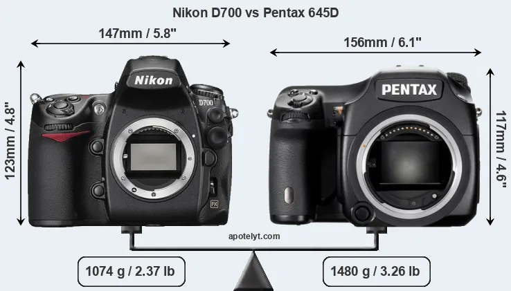 La Nikon D700 e la Pentax 645D sono due fotocamere digitali rivelate al pubblico rispettivamente a luglio 2008 e marzo 2010. Entrambe sono fotocamere DSLR (Digital Single Lens Reflex) che sono dotati di un sensore full frame (D700) e un sensore di medio formato (645D). La Nikon ha una risoluzione di 12,1 megapixel, mentre la Pentax fornisce 39,5 MP.