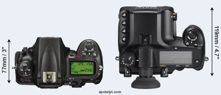 La dimensione fisica e il peso della Nikon D700 e Pentax 645D sono illustrate nel grafico sottostante. Le due fotocamere vengono visualizzate in base alle loro dimensioni relative. Tutte le dimensioni sono arrotondate al millimetro più vicino.