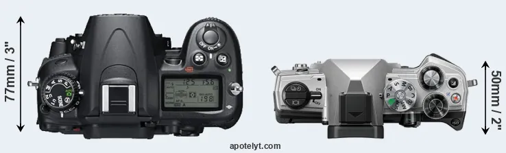 La dimensione fisica e il peso della Nikon D7000 e OM System OM-5 sono illustrate nel grafico sottostante. Le due fotocamere vengono visualizzate in base alle loro dimensioni relative. Tutte le dimensioni sono arrotondate al millimetro più vicino.