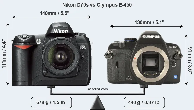 La Nikon D70s e la Olympus E-450 sono due fotocamere digitali rivelate al pubblico rispettivamente a aprile 2005 e marzo 2009. Entrambe sono fotocamere DSLR (Digital Single Lens Reflex) che sono dotati di un sensore APS-C (D70s) e un sensore Quattro Terzi (E-450). La Nikon ha una risoluzione di 6,0 megapixel, mentre la Olympus fornisce 10,0 MP.