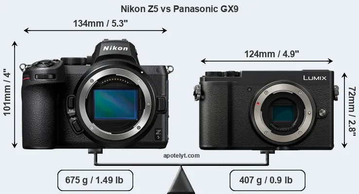La Nikon Z5 e la Panasonic Lumix DC-GX9 sono due fotocamere digitali rivelate al pubblico rispettivamente a luglio 2020 e febbraio 2018. Entrambe sono fotocamera mirrorless con obiettivo intercambiabile, che sono dotati di un sensore full frame (Z5) e un sensore Quattro Terzi (GX9). La Nikon ha una risoluzione di 24,2 megapixel, mentre la Panasonic fornisce 20,2 MP.