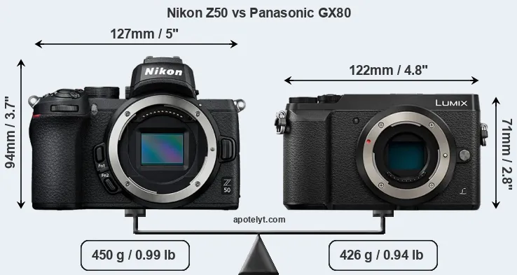 La Nikon Z50 e la Panasonic Lumix DMC-GX80 sono due fotocamere digitali rivelate al pubblico rispettivamente a ottobre 2019 e aprile 2016. Entrambe sono fotocamera mirrorless con obiettivo intercambiabile, che sono dotati di un sensore APS-C (Z50) e un sensore Quattro Terzi (GX80). La Nikon ha una risoluzione di 20,7 megapixel, mentre la Panasonic fornisce 15,8 MP.