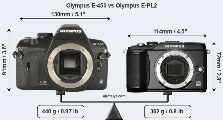 La Olympus E-450 e la Olympus PEN E-PL2 sono due fotocamere digitali rivelate al pubblico rispettivamente a marzo 2009 e gennaio 2011. Il E-450 è una fotocamera DSLR, mentre E-PL2 è una fotocamera mirrorless con obiettivo intercambiabile.Entrambe le fotocamere sono dotati di un sensore Quattro Terzi. La E-450 ha una risoluzione di 10,0 megapixel, mentre la E-PL2 fornisce 12,2 MP.