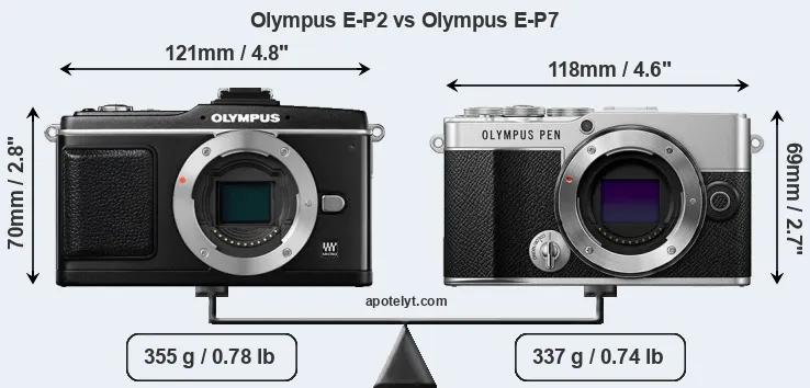 La dimensione fisica e il peso della Olympus E-P2 e Olympus E-P7 sono illustrate nel grafico sottostante. Le due fotocamere vengono visualizzate in base alle loro dimensioni relative. Tutte le dimensioni sono arrotondate al millimetro più vicino.
