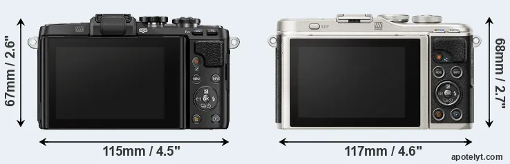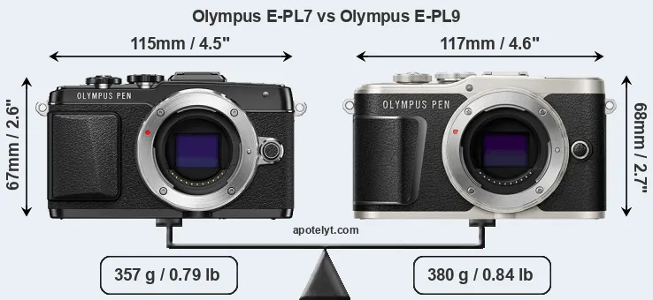 La dimensione fisica e il peso della Olympus E-PL7 e Olympus E-PL9 sono illustrate nel grafico sottostante. Le due fotocamere vengono visualizzate in base alle loro dimensioni relative. Tutte le dimensioni sono arrotondate al millimetro più vicino.