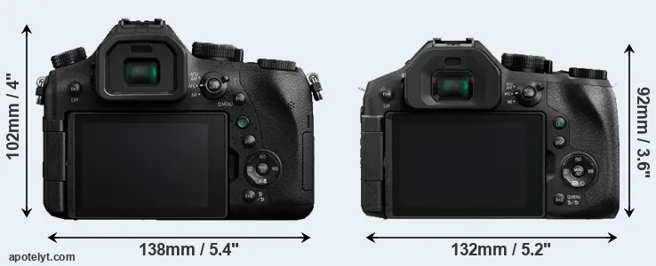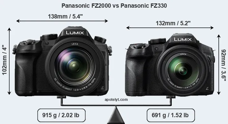 La dimensione fisica e il peso della Panasonic FZ2000 e Panasonic FZ330 sono illustrate nel grafico sottostante. Le due fotocamere vengono visualizzate in base alle loro dimensioni relative. Tutte le dimensioni sono arrotondate al millimetro più vicino.