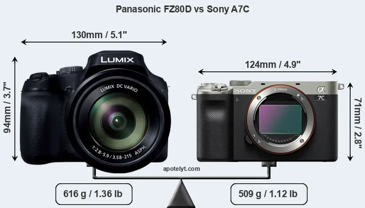 La dimensione fisica e il peso della Panasonic FZ80D e Sony A7C sono illustrate nel grafico sottostante. Le due fotocamere vengono visualizzate in base alle loro dimensioni relative. Tutte le dimensioni sono arrotondate al millimetro più vicino.